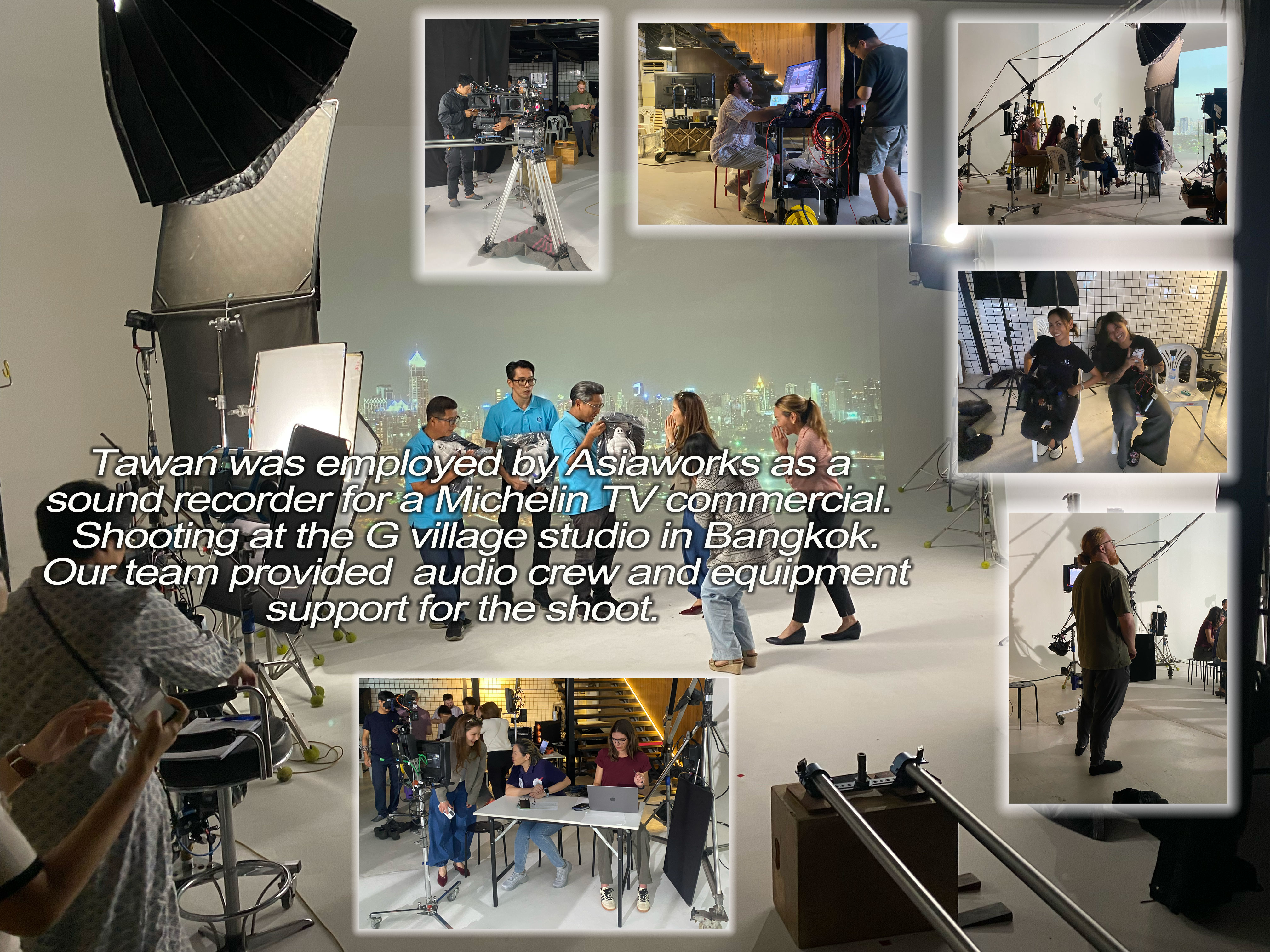 Tawan was employed by Asiaworks as a sound recorder for a Michelin TV commercial. Shooting at the G Village studio in Bangkok. Our team provided audio crew and equipment support for the shoot.